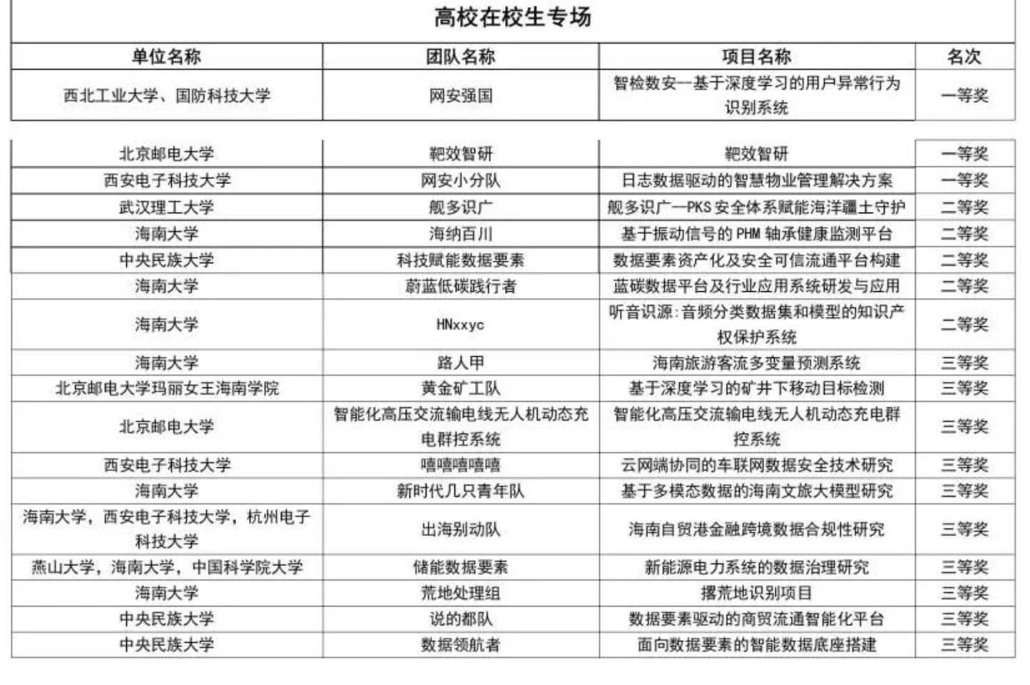 (通讯员:谢政)9月20日,2024年“数据要素×”大赛海南分赛决赛在海南大学国际学术交流中心与海南陵水黎安国际教育创新试验区成功举办,于9月24日公布获奖名单。ag旗舰厅官方网站站学子在本届大赛中喜获佳绩,全部进入决赛,来自“网安小分队”的《日志数据驱动的智慧物业管理解决方案》获得一等奖,来自“嘻嘻嘻嘻嘻”的《云网端协同的车联网数据安全技术研究》获得三等奖。