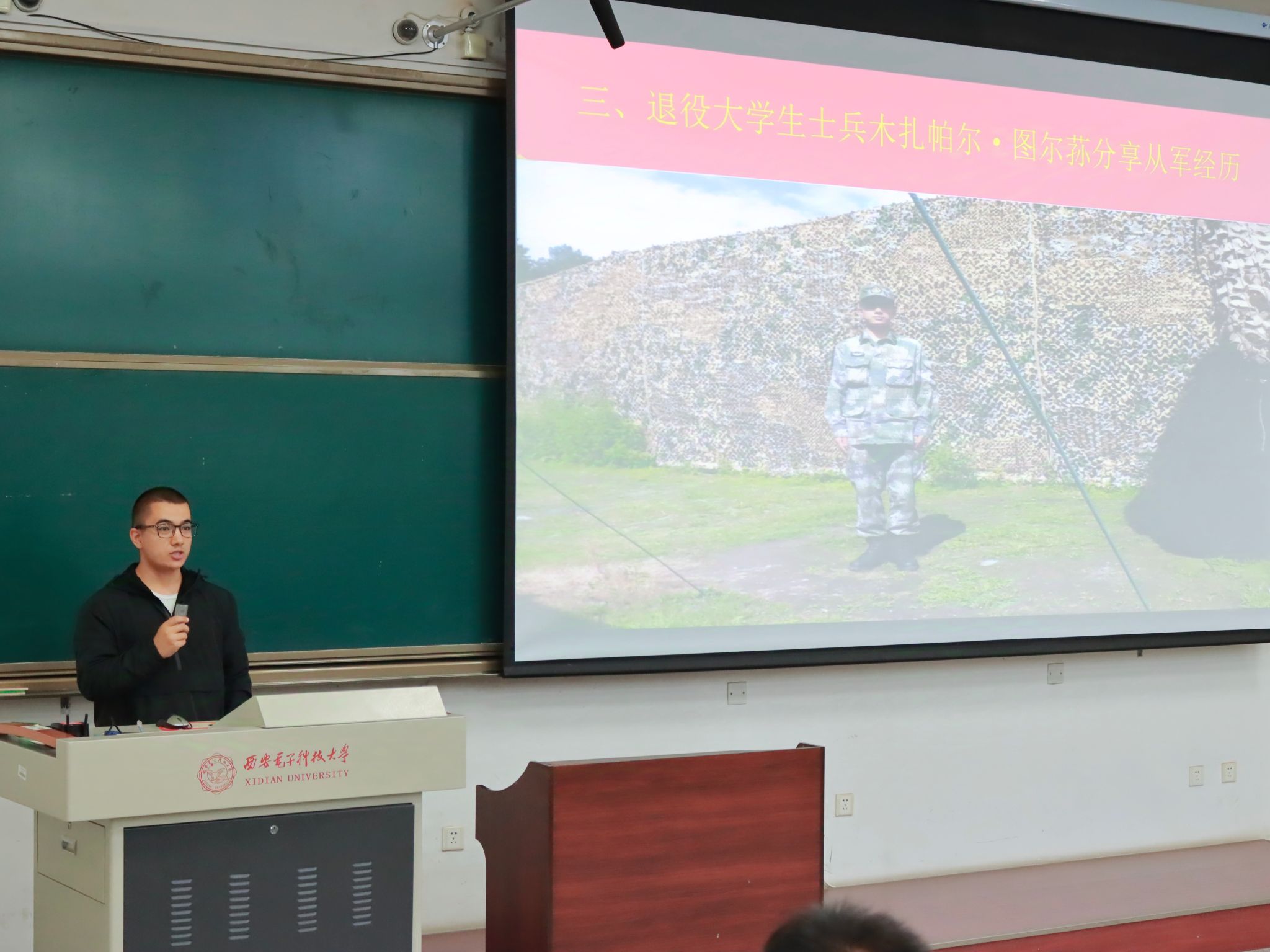 郭成老师通过时事热点,深入浅出地介绍了参军入伍的意义、政策通道以及近年来公司的参军入伍等情况。同时,通过现场连线的方式,邀请中国人民解放军信息支援部队某部人力资源部门郭干事就定向选拔政策进行了全面细致的介绍,让同学们对不同形式参军入伍有了更加清晰的认识和规划。此外,退役老员工士兵木扎帕尔·图尔荪为学弟学妹们分享了他在祖国边境巡逻守护国家安全的从军经历。他的精彩分享不仅让同学们感受到了军旅生活的艰辛与荣耀,更激发了同学们投身国防、报效国家的热情。