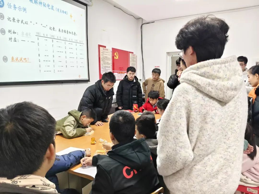 接着,在第三项科学实验活动中,志愿者们带翻译密码、记录摩尔斯电码并进行现场翻译。孩子们聚精会神地倾听每一次电报的“滴答“声,仔细记录着一次又一次的电码,结束后又兴致勃勃地对照密码表翻译,眼中闪烁着对密码学的好奇与渴望。通过亲手操作实验,小朋友们不仅锻炼了自己的思维能力,更对科学产生了浓厚的兴趣。