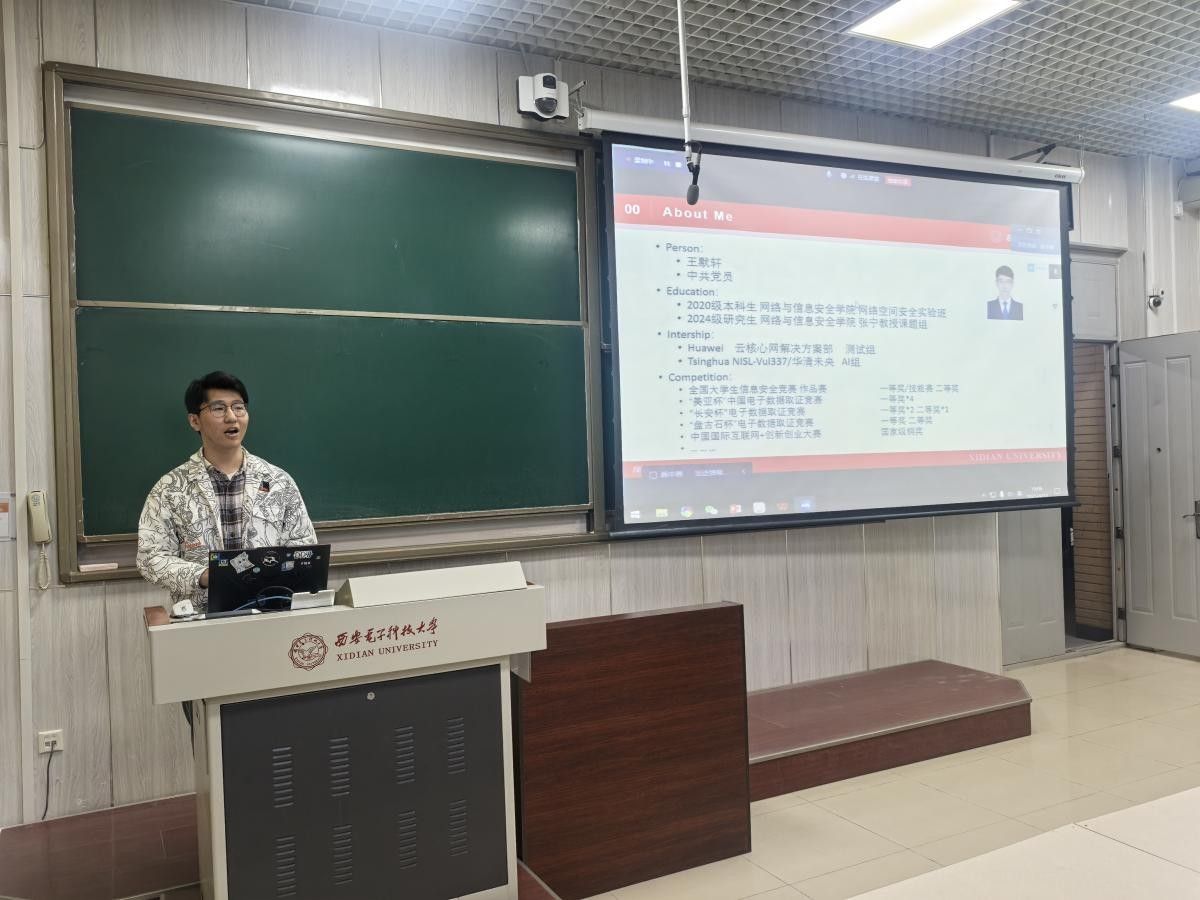 4月20日,艾芃旭首先详细介绍了校内 mini-CTF 竞赛的背景、流程及技术要点。他结合自身参赛经历,分享了 CTF 竞赛中漏洞挖掘、密码学、逆向工程等核心方向的学习方法。随后,学长结合大二升大三的关键时间节点,与同学们探讨了专业发展规划。他建议同学们在学业相对灵活的大三阶段,明确职业方向,针对性地学习前沿技术,例如网络安全攻防、数据安全、区块链等领域。
