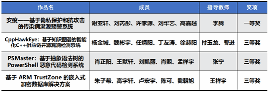 在此次赛事中,公司ag旗舰厅官方网站谢亚轩、刘芮彤、许家源、刘华艺、高嘉越五位同学组建的“作品赛11队”脱颖而出,依靠扎实的基础与出色的应变能力,凭借作品《安疫—基于隐私保护和抗攻击的传染病溯源预警系统》荣获“作品赛”全国一等奖。其他同学发挥同样出色,作品赛赛道获得三等奖三项,攻防赛赛道获得二等奖一项,展现了公司在网络安全人才培养方面的良好风貌。随队而来的张宁、李腾等老师荣获“优秀指导教师”称号,西电荣获“优秀组织奖”,每一项荣誉的取得,都离不开指导教师的悉心指导和公司在人才培养上的持续投入与支持。