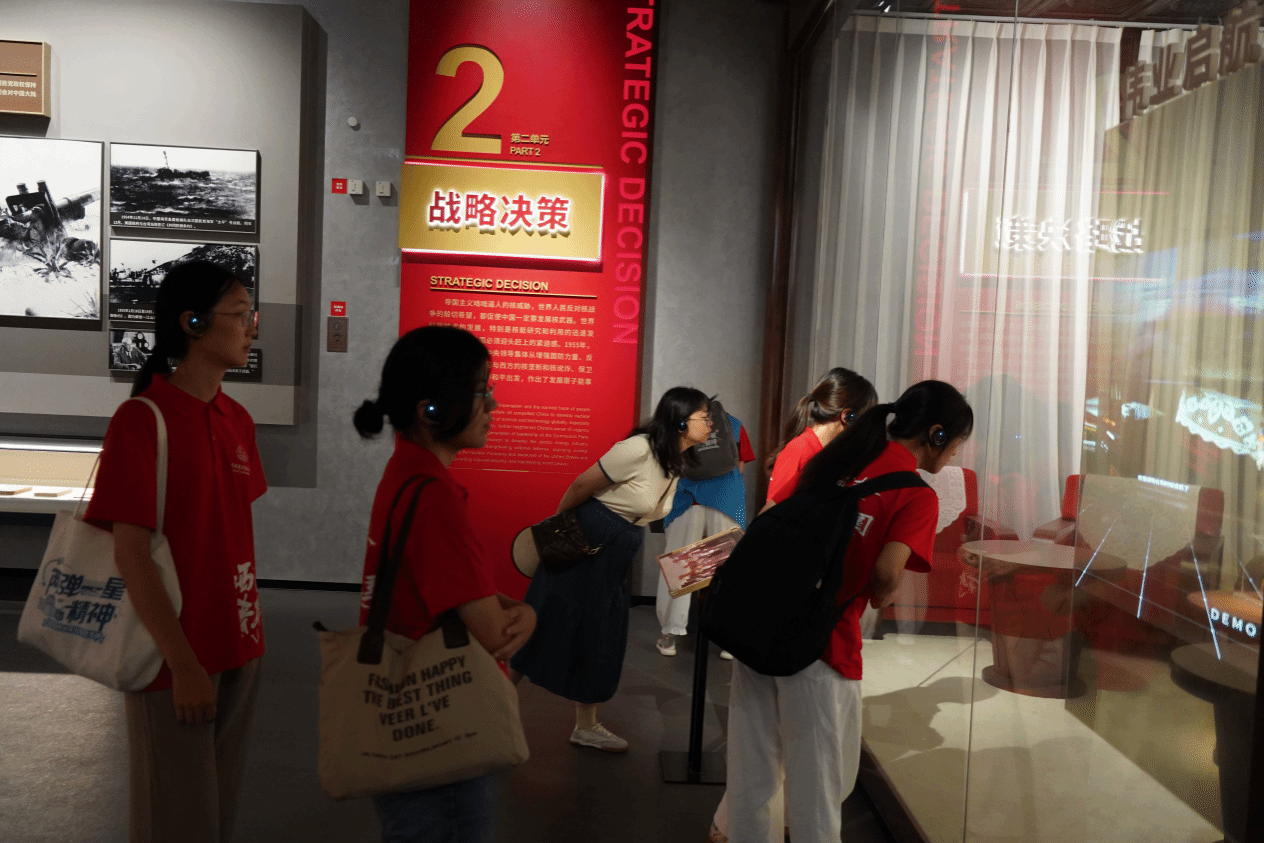 在参观环节,实践队员紧紧跟随着讲解员的脚步,去聆听那段在戈壁风沙中淬炼初心、用算盘珠子敲出星辰大海的故事。那些在零下三十度的帐篷里呵气暖手继续演算的夜晚,那些隐姓埋名与家人隔空相望的岁月,那些用热血与智慧在空白处书写奇迹的日夜,都藏在每一页泛黄的手稿、每一件斑驳的仪器里,在时光深处闪烁着永不褪色的光芒。通过详实的史料、珍贵的文物和生动的场景再现,队员们深入学习了爱国科学家们“干惊天动地事,做隐姓埋名人”的光辉事迹、“两弹一星”事业从无到有的峥嵘岁月以及辉煌成就,并从中汲取到强大的精神动力和爱国情怀。