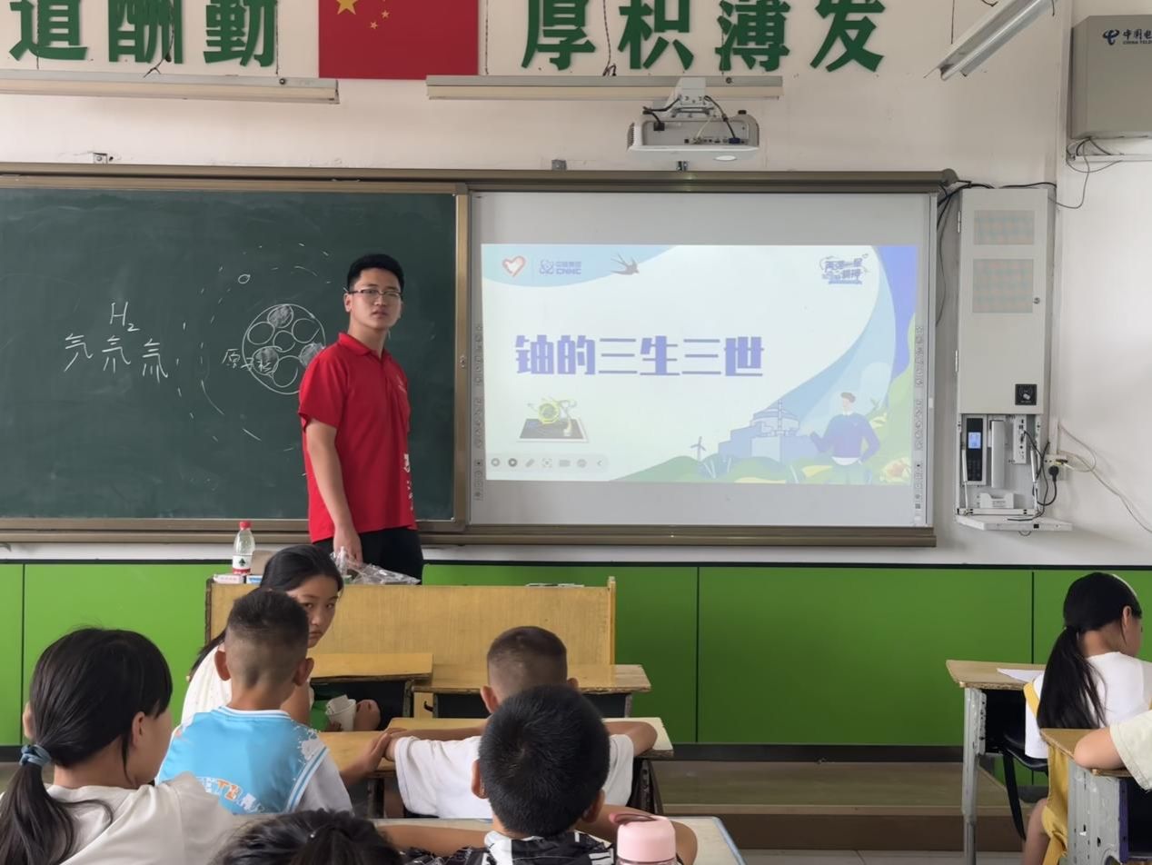 团队成员以专业视角和生动讲述,展现了中国核工业的创新发展和时代贡献,让孩子们更加全面地认识到中国核工业从跟跑到领跑的巨大跨越。蒋兆鑫同学以《铀的三生三世》为题,从核反应原理、铀的提取与利用等角度,系统介绍了铀元素在核能领域的关键作用,探索原子世界的奥秘。