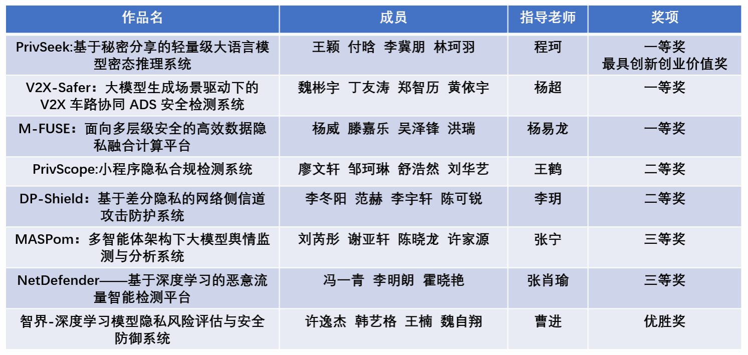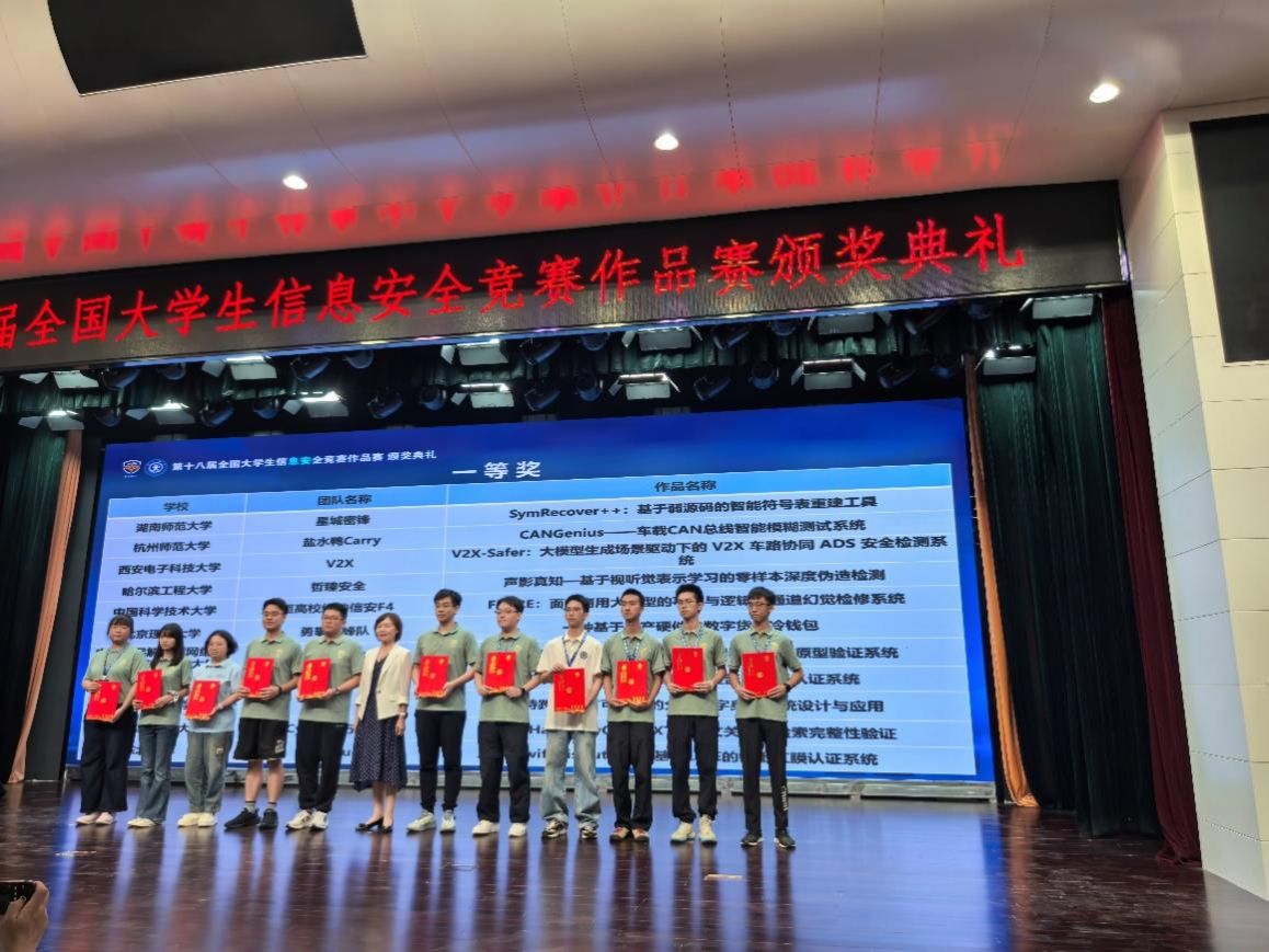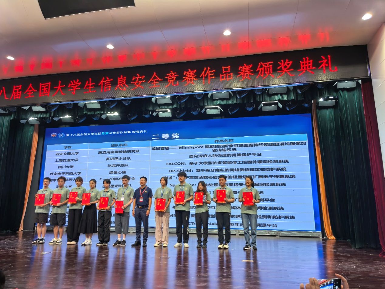 (通讯员:丁友涛,张宁)2025年8月14日,第十八届全国老员工信息安全竞赛作品赛决赛在西安交通大学兴庆校区举办,西电学子在本届竞赛中再创佳绩,共获一等奖3项,二等奖2项,三等奖2项,优胜奖1项,西电学子荣获奖牌数全国高校第一。其中,《PrivSeek:基于秘密分享的轻量级大语言模型密态推理系统》尤为突出,获“最具创新创业价值奖”。