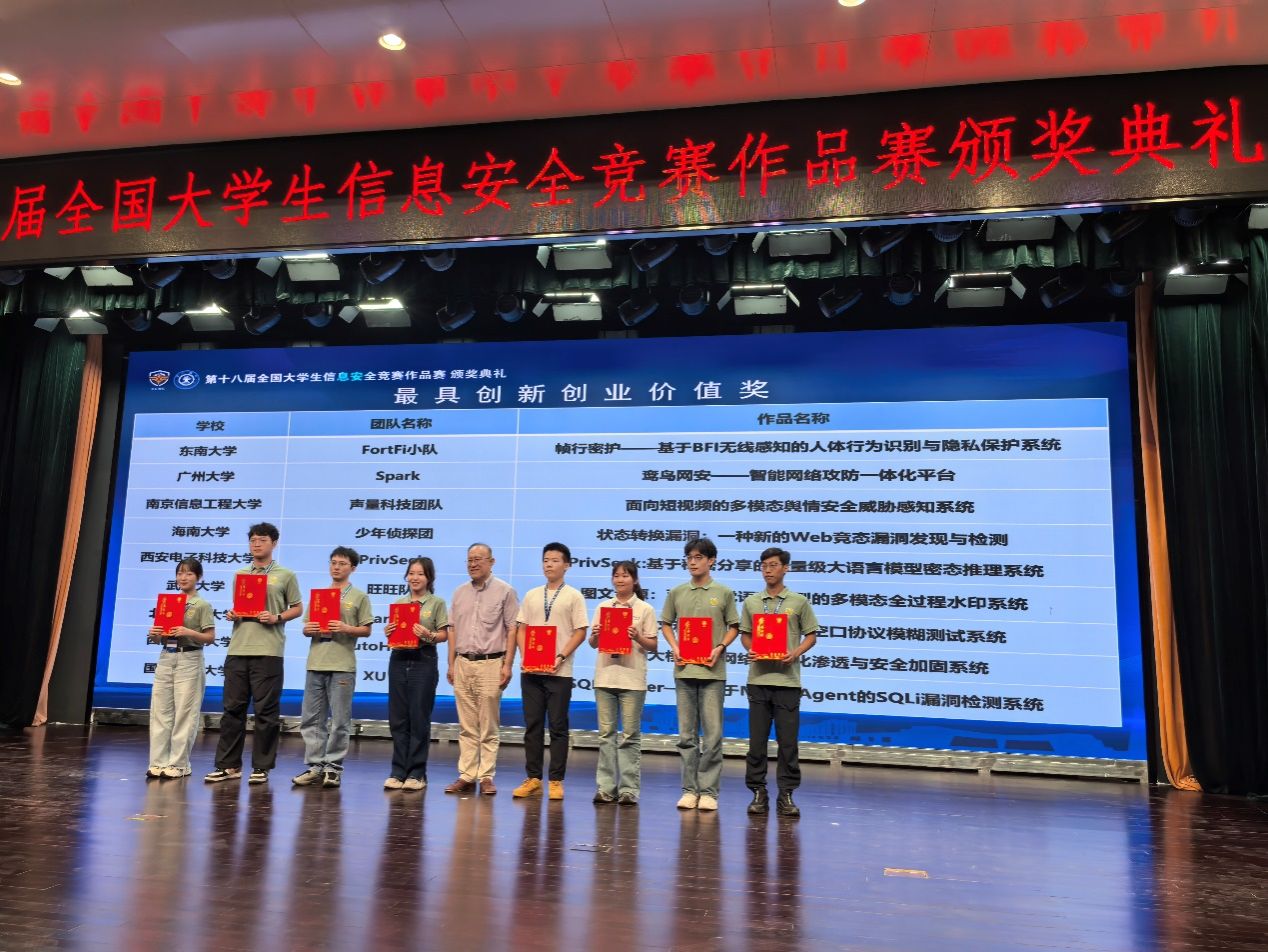 自2025年4月启动以来,公司网络安全竞赛基地共组织33支队伍参赛,选手们充分利用课余时间,通力合作,攻坚克难,完成了作品设计与报告撰写,最终8支队伍进入总决赛(每校最多8支)。同学们在暑假期间克服重重困难,经过8月14和15日两天激烈的比拼,公司员工最终荣获一等奖3项,二等奖2项,三等奖2项,优胜奖1项,最具创新创业价值奖1项。