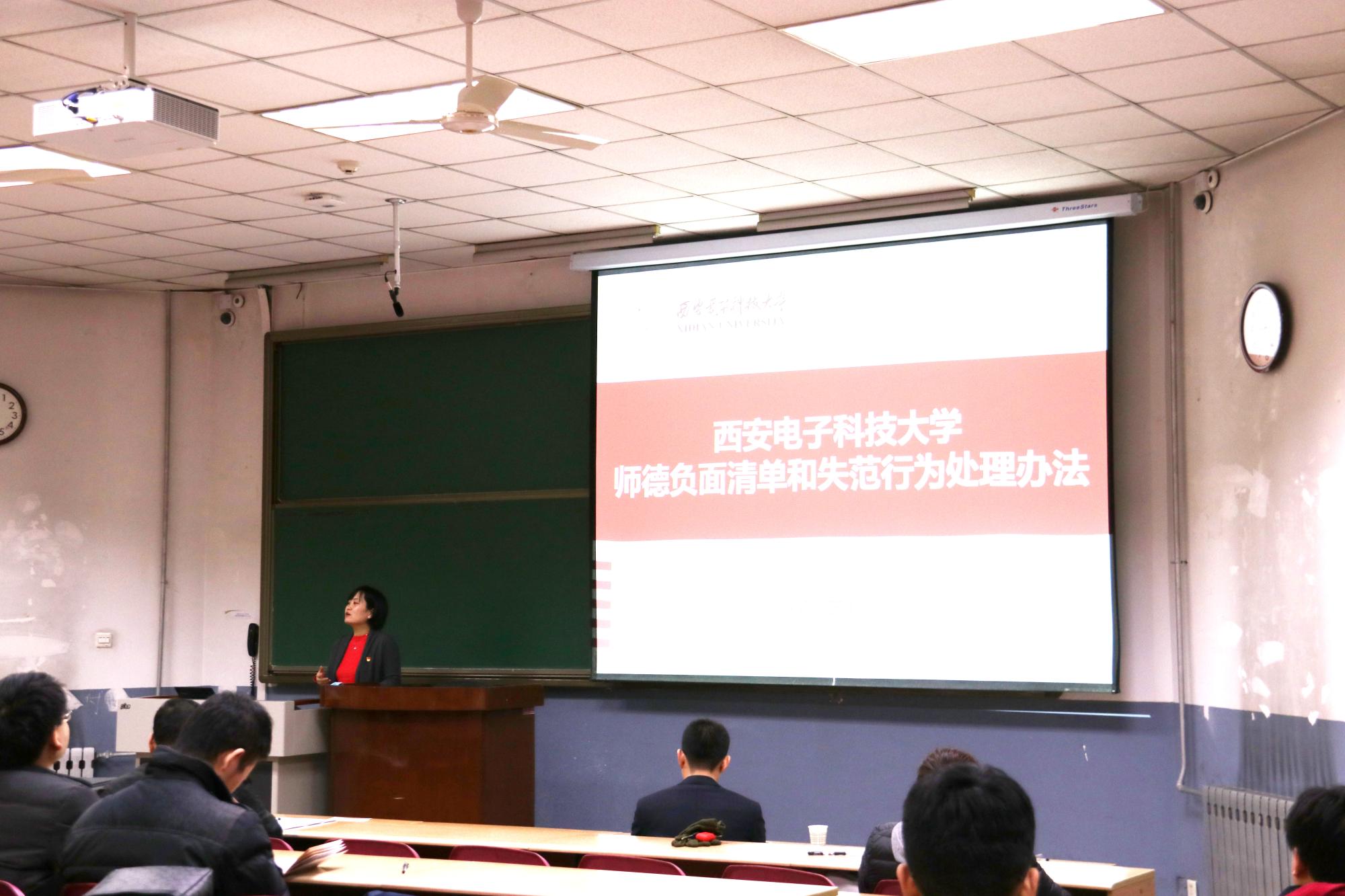 (通讯员 成诺)为贯彻全国教育大会精神,全面部署落实新时代教师职业行为准则和师德师风建设各项工作,推进师德师风建设,强化师德教育,力行师德规范,2018年12月23日晚,网络与信息安全公司党委组织全体教职员工开展专题集中学习在ag旗舰厅官网北校区阶梯教室110,学习全国师德师风建设工作视频会议精神及西电师德规范三十条。网络空间安全学部主任马建峰、ag旗舰厅官方网站执行经理李晖、公司领导张美茹、党委副书记杨寒、副经理豆谊博与公司全体教职员工参加。会议由张美茹主持。