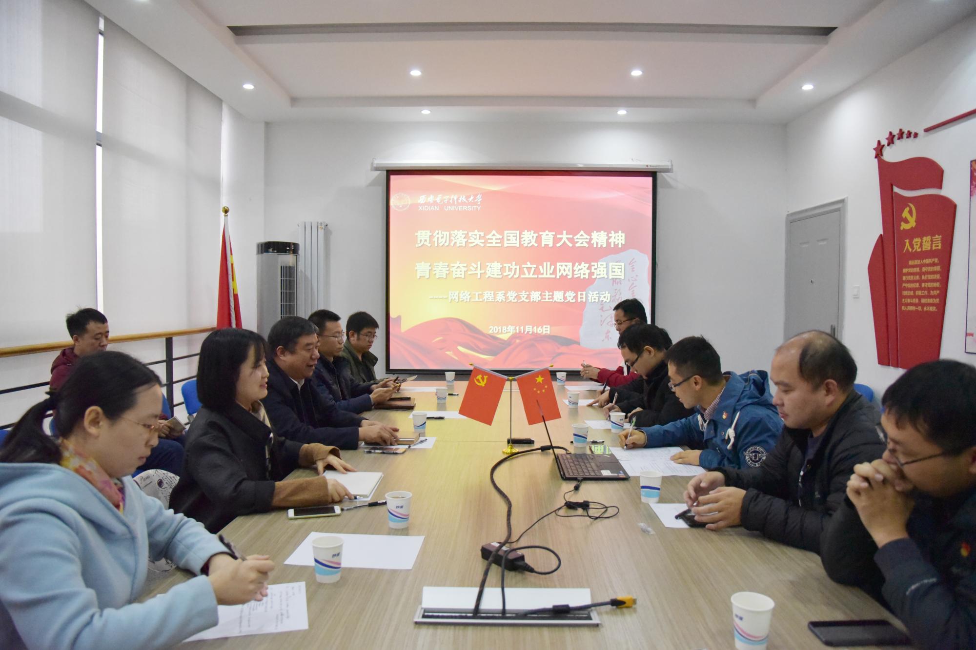 (通讯员 张沂娜)11月16日上午,ag旗舰厅官方网站网络工程系“贯彻落实全国教育大会精神 青春奋斗建功立业网络强国”党支部主题党日活动在南校区行政辅楼215举行,党委副书记杨银堂作为联系该支部的校领导出席活动并讲话。公司领导张美茹同志、杨寒同志和网络工程系全体党员参加活动,活动由网络工程系党支部书记杨超同志主持。