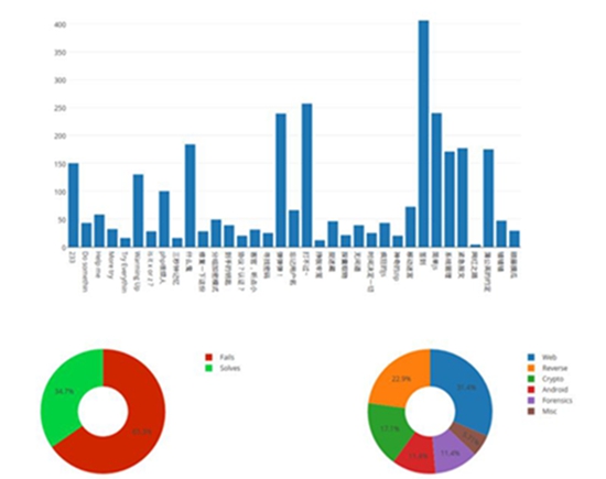 此次竞赛共有1036支队伍参加,比赛题目共35道,题目内容涉及Web渗透、密码分析、取证分析、逆向分析、移动安全等网络安全知识。比赛题目专业性较强,覆盖面广,重在检验各参赛队伍理论水平和实战技术的综合运用,其中题目《网红之路》只有四支队伍找到解决办法。比赛中,各路大神各显神通,答题过程十分精彩,下图为本次比赛题目以及题目答题情况的图表。