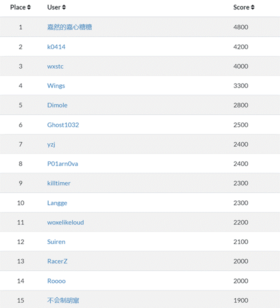 最终共计150余人夺得有效分数并获取排名,最终前15名排名如下: