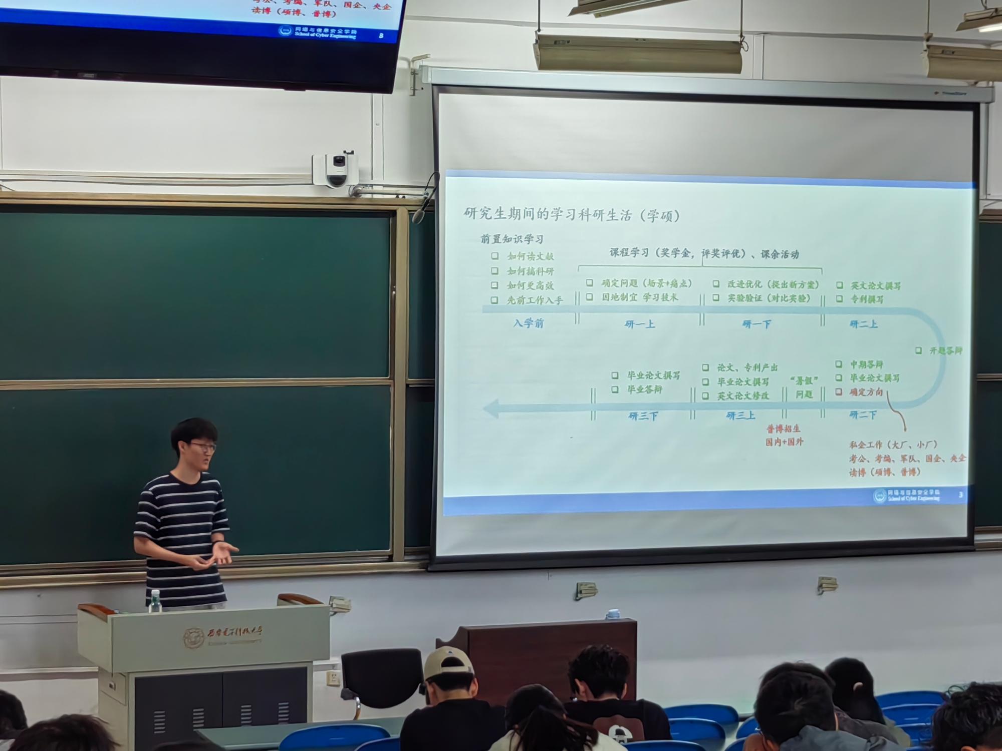 蔡宇轩以“研究生期间的学习科研生活”为主题,向同学们分享了研究生期间的学习、科研、访学、生活情况,建议同学们在大学期间注重培养自己的学术能力、代码能力和沟通能力,同时也要增强挫折承受能力和压力排解能力。