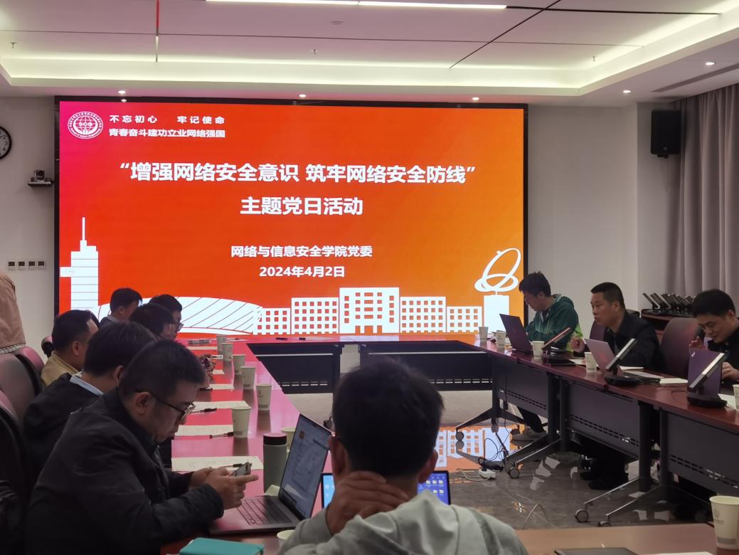 (通讯员 赵书漫 赵秀臣)2024年4月2日下午,网络与信息安全公司党委在网络安全创新研究大楼A121会议室,组织召开“增强网络安全意识 筑牢网络安全防线”主题党日活动。活动邀请国家安全人民防线领导小组办公室副主任/科学研究院副经理兼保密办公室副主任杨卫亚、校法务办公室主任/国家安全人民防线领导小组办公室主任李明作专题报告。公司机关管理干部、人民防线委员会成员、教师党支部委员、员工党支部代表参会。会议由党委副书记张国良主持。