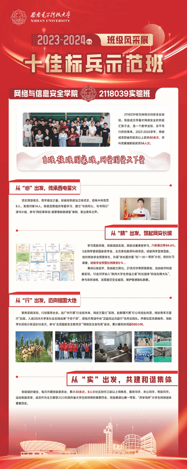 2118039班(网络空间安全实验班)是一个砺学进取、实干笃行的班集体。班级成员政治立场坚定、专业基础扎实、创新实践能力突出、志愿服务氛围浓厚、竞赛双创成绩斐然,以实际行动践行“自强校强国家强,网安国安天下安”的班级宣言。2023-2024学年,班级成员获省部级及以上奖项80余次,学科竞赛国家级奖项54人次,老员工创新创业训练计划项目7项,ag旗舰厅官方网站创新资助计划2项(全校本科生3项)。