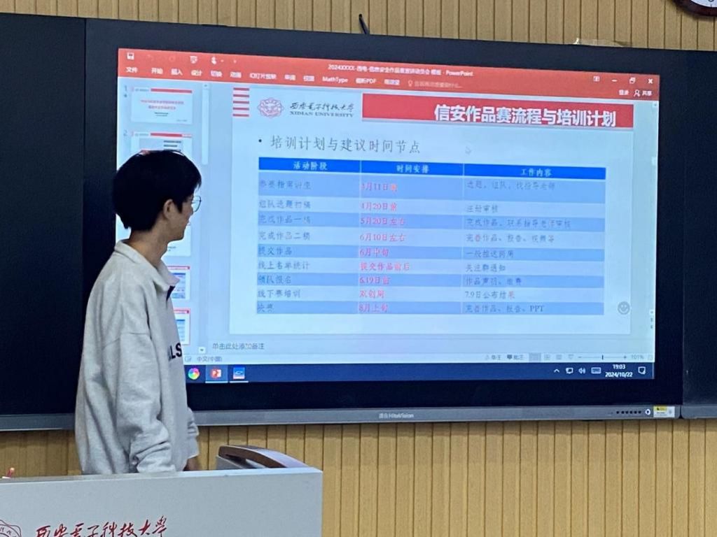 10月22日,许逸杰学长为同学们分享了自己信安作品赛的经历。在宣讲会上,许学长采用了“先总后分”的结构,首先为大家勾勒出竞赛的整体框架,使同学们对竞赛有了初步的了解。随后,他通过层层深入的方式,详细讲解了各个环节的要点和注意事项。他重点介绍了往届信安作品赛的获奖情况,帮助同学们了解成功作品的特点与趋势。同时,他还分享了赛前准备的关键步骤,包括选题思路、团队组建和时间管理等。此外,许学长结合自己的经验,分析了参赛作品的创作要点和评审标准,为同学们提供了切实可行的建议。宣讲的最后环节,许学长耐心地回答了同学们的提问,解答了他们在准备过程中遇到的困惑。对竞赛充满热情的同学们纷纷向许学长请教,许多同学还主动添加了他的微信,期待进行更深入的交流与探讨。