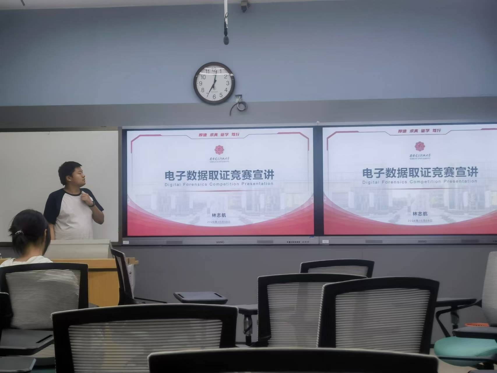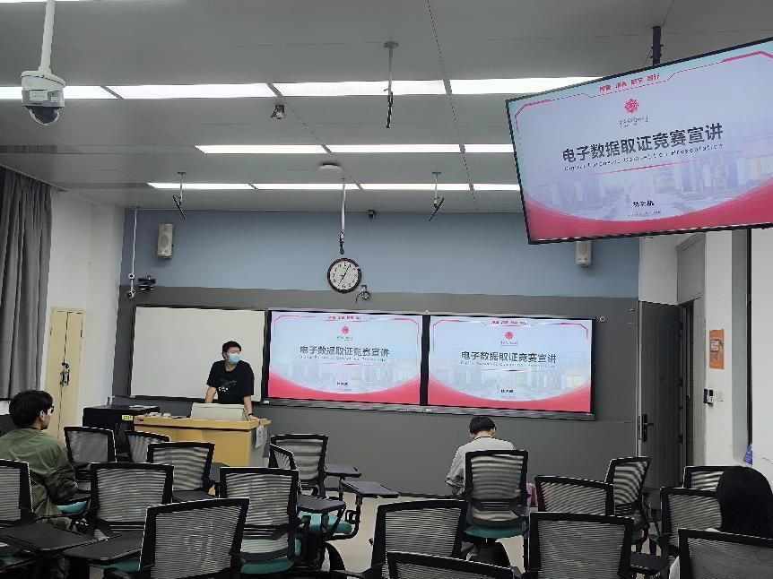 林志航同学为大家带来了电子数据取证竞赛宣讲,向同学们介绍电子数据取证竞赛,明确电子数据取证竞赛的内容和所需知识技能,宣传参赛相关知识。他从一个真实的网络诈骗案例入手,开门见山为大家介绍了什么是电子数据取证。接着,他详细介绍了电子数据取证技术涵盖的内容,以及在法律调查、法庭诉讼等领域的应用,并逐一拆解讲述了电子数据取证技术包含的各种技术。为大家揭开了这个领域的神秘面纱。他强调,参赛者需要磨砺数据识别、收集、恢复及分析技能,并深入浅出地剖析了如美亚杯、盘古石杯、长安杯等赛事的独特魅力与挑战梯度,为参与者指明竞赛选择方向。他热情洋溢地发出邀请,鼓励更多同学踏上这场探索之旅,共同书写属于自己的精彩篇章。