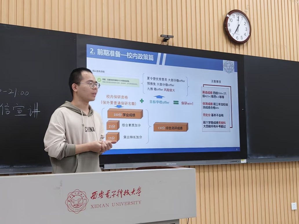 为了帮助同学们掌握保研的基本流程和前置需求,21级优秀保研学长盖乐分享了自己的经历。盖乐学长从自我介绍开始,重点分享了他本科阶段的基本成绩、竞赛获奖情况和他的保研去向。他从西电的保研政策开始解读,仔细讲解了保研的基本要求,前置条件以及一些注意事项。校内保研资格的获取由学业成绩和综测成绩组成,基本注意事项还有英语成绩,体测成绩,无处分记录,无挂科记录等。之后,他讲到保研的基本流程、保研的重要时间线以及保研的基本材料要求并分享了自己的保研过程、大三全国各地拿offer的经历,还为同学们讲了不同公司夏令营的区别和不同公司的考核方式,以及他自己备战保研复试的一些心得体悟。谈到保研的心得体悟,盖乐学长勉励大二同学们好好学习,了解保研的基本流程和规则后,应该积极着手准备保研的相关材料来包装自己,也要提升学习成绩,这是保研的入门条件。