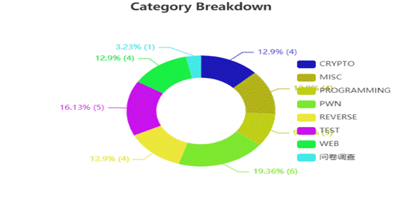 本次比赛共放出题目24道。其中Misc方向4道、Crypto方向4道、Pwn方向5道、Reverse方向4道、PPC方向2道、Web方向4道以及赛后问卷题1道。