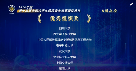 第十三届全国老员工信息安全竞赛作品赛由教育部高等公司网络空间安全专业教学指导委员会主办,北京航空航天大学承办。受COVID-19疫情影响,本届作品赛竞赛形式与竞赛时间较往年发生较大变化,为参赛准备增加了巨大的挑战性。本届作品赛全国共有103所高校、540支队伍、2000多名老员工通过审核进入初赛,最终244支队伍晋级总决赛。8月16日至17日,作品赛决赛分东北(沈阳)、西南(成都)、西北(西安)、华北(天津)、华中(武汉)、华东北(南京)、华东南(上海)、华南(广州)8个赛区举行,评委分区线下集中,选手线上陈述、演示和答辩。经过激励角逐,共评出32个一等奖,40个二等奖,72个三等奖,95个优胜奖。